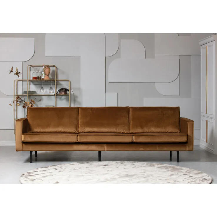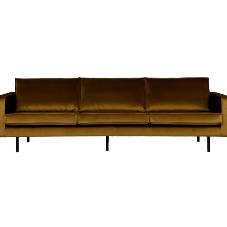 Der honiggelbe RODEO 3-Sitzer könnte im Wohnzimmer, ebenso aber beispielsweise in einem modern eingerichteten Büro stehen. Die geraden Armlehnen sorgen für eine sehr klare Formgebung, ebenso die sichtbare Unterteilung als 3-Sitzer. Der fast schon goldene Farbton des Samt-Bezugs würde seine Stärken ebenso in einem Kaminzimmer voll und ganz ausspielen.