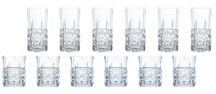 Das SPIEGELAU Trinkglas-Set ELEGANCE wird mit 12 Teilen geliefert. Sie bestehen aus transparentem Glas. Enthalten sind 6 Longdrinkgläser und 6 Whiskygläser. Alle Gläser sind spülmaschinengeeignet.