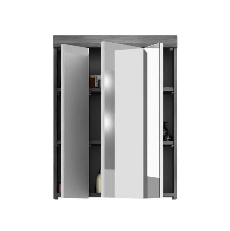 Der 60 x 79 cm große Spiegelschrank SCOUT ist eine clevere Lösung, um den Platz im heimischen Badezimmer optimal zu nutzen. Was den Hängeschrank auszeichnet, ist die Kombination von spiegelnden Flächen und dunkelgrauen Parts aus Holzwerkstoff.