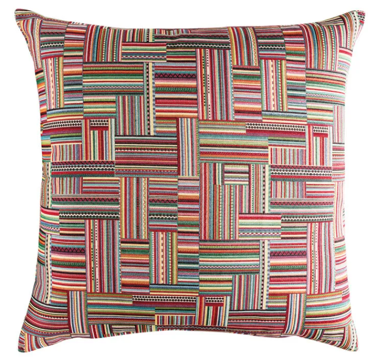 Das Material besteht aus einem Mischgewebe mit 28 % Baumwolle, 58 % Polyester und 14 % Acryl. Die Oberfläche wirkt strukturiert und robust, was die Kissenhülle für den täglichen Gebrauch geeignet macht. Die Farbgestaltung ist mehrfarbig und hebt die grafische Wirkung des Musters hervor. Die Kissenhülle ist für Kissen in der Größe 50 x 50 cm vorgesehen und zeichnet sich durch ein modernes, detailreiches Design aus.