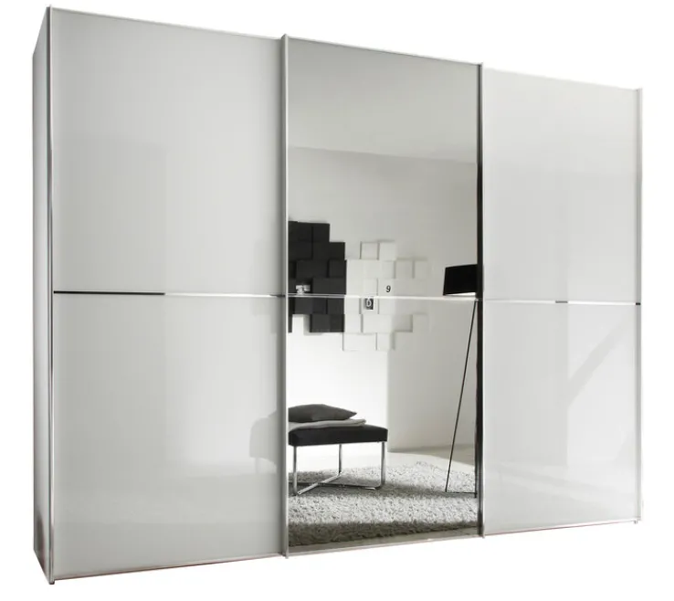 Der 3-türige Kleiderschrank SINFONIE PLUS VIII von STAUD in der Farbe alpinweiß hat ein zeitloses Design. Durch seine Fronten mit einem Spiegel in der Mitte, Türen mit Alpinweißglas sowie chromfarbigen Griff- und Zierleisten passt der Schwebetürenschrank mit einer Breite von 280 cm in das modern eingerichtete Schlafzimmer. Der intelligent unterteilte Innenraum mit sechs Fachböden und drei Kleiderstangen bietet viel Platz und Stauraum für Wäsche und Kleidung.