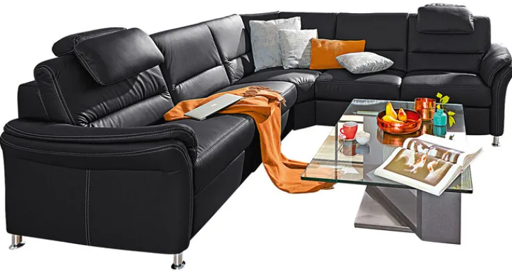 Das Ecksofa CROTONE R präsentiert sich in einem klassischen, modernen Stil mit einer großzügigen Schenkellänge von 262 cm auf beiden Seiten. Die Hauptfarbe ist ein tiefes Anthrazit, unterstützt von alu- beziehungsweise nickelfarbigen Metallfüßen aus Aluminium. Die Oberfläche zeigt eine glatte, fein genarbte Textur, die durch helle Kontrastnähte optisch hervorgehoben wird und dem Sofa eine klare, strukturierte Linienführung verleiht. Die Polster bestehen aus Kaltschaum mit Nosagfederung, was für einen komfortablen und langlebigen Sitz sorgt. Die Sitzhöhe beträgt 46 cm und das Gesamtgewicht liegt bei 185,5 kg. Die Breite des Modells misst 156 cm, die Ausladung beträgt 262 cm. Das Sofa ist besonders für den Wohnbereich geeignet und bietet durch seine großzügige U-Form viel Platz für mehrere Personen. Die Rückenlehnen sind hoch und bieten gemeinsam mit den integrierten Kopfstützen zusätzlichen Komfort. Die Materialwahl und Verarbeitung unterstreichen die Beständigkeit und das hochwertige Erscheinungsbild dieses Möbelstücks.