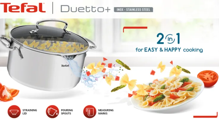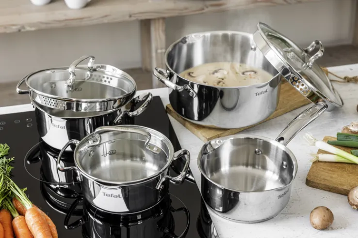 Das Kochtopf-Set der Serie DUETTO besteht aus insgesamt sieben Teilen und ist aus silberfarbenem Edelstahl gefertigt. Die Töpfe und der Stieltopf weisen eine runde Form auf und verfügen über robuste, ergonomisch geformte Griffe. Die Oberfläche zeigt eine glänzende, glatte Edelstahloptik, die dem Set ein modernes und zeitloses Erscheinungsbild verleiht. Die Deckel sind aus transparentem Glas mit Edelstahlrand gestaltet und ermöglichen eine gute Kontrolle des Kochvorgangs. Im Inneren der Kochtöpfe sind praktische Messskalen sichtbar eingraviert.