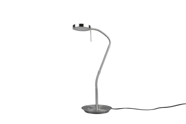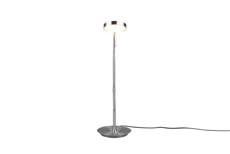 Der Lampenschirm, das individuell einstellbare Gestänge und der Fuß der Tischlampe für den Innenbereich sind aus Metall gefertigt. Die Oberflächen haben einen schönen Glanz. Das energieeffiziente LED-Leuchtmittel ist fest eingebaut und sitzt hinter einer runden Kunststoffscheibe. Das Leuchtmittel hat eine Lebensdauer von etwa 30.000 Stunden.