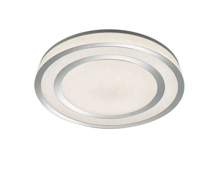 Die Deckenlampe besteht aus hochwertigem Kunststoff und hat eine kreisrunde, sehr flache Form. Die Kombination aus chromfarbigen und weißen Elementen verleiht ihr eine moderne Note und sorgt dafür, dass sie an einer weißen Decke kaum auffällt. Die 1-flammige Lampe enthält ein energiesparendes LED-Leuchtmittel. Das bringt eine Lichtleistung von 4750 lm und eine Farbtemperatur von 5500 K mit sich. Außerdem brennt es bis zu 30.000 Stunden. Die Lampe ist dimmbar und lässt sich ganz bequem per Fernsteuerung bedienen.