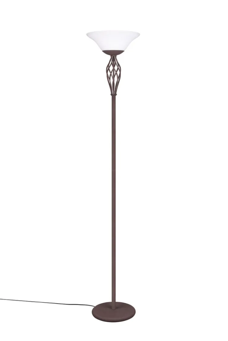 Der Deckenfluter aus der Serie RUSTICA von Trio vereint Funktionalität und ansprechendes Design im Landhausstil. Mit einer Höhe von 180 cm und einem Durchmesser von 33,5 cm fügt sich die Lampe harmonisch in verschiedene Wohnräume ein. Die Hauptfarbe ist ein elegantes Rostbraun, das durch weiße Glaselemente ergänzt wird. Der runde Tellerfuß sorgt für Stabilität und unterstreicht das klassische Design.