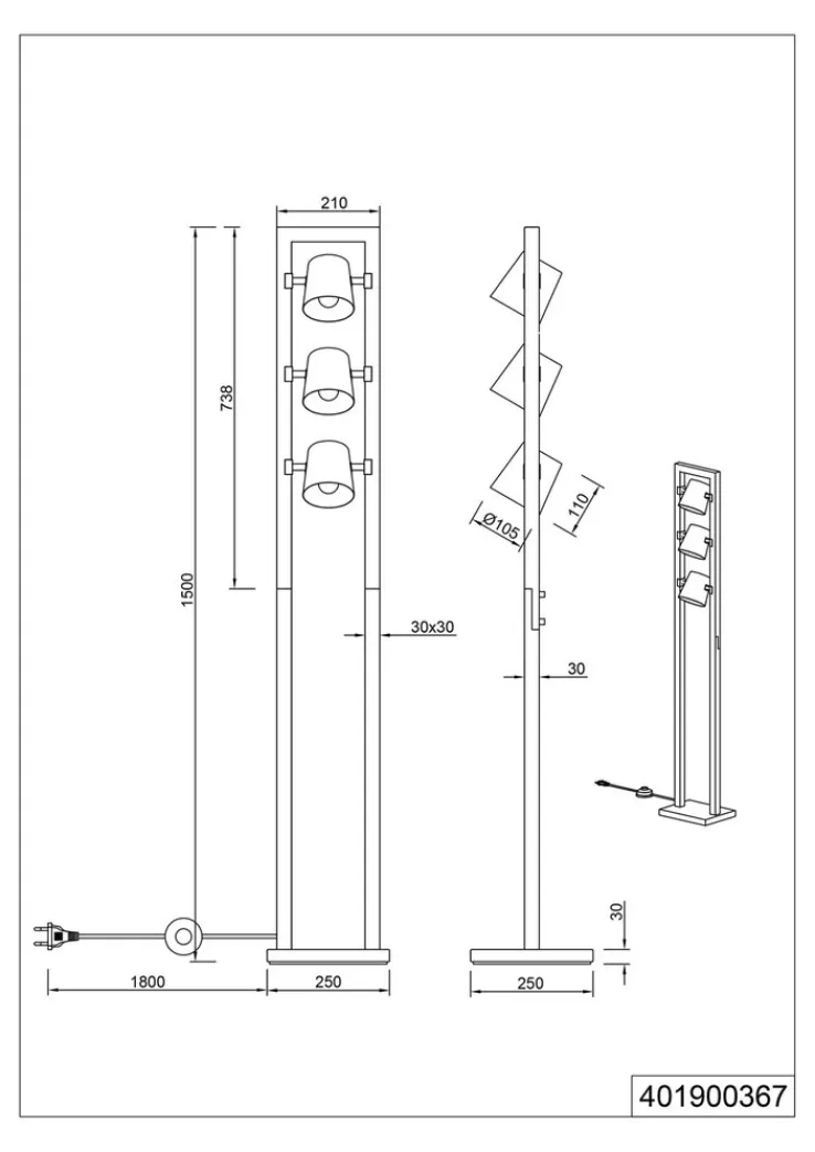 Das Gestänge der Stehlampe ist aus Holz gefertigt und hat eine schöne Maserung. Der viereckige Fuß und die leicht konisch geformten Lampenschirme bestehen aus Metall. Für die AGL/Retrofit Leuchtmittel bis 25 Watt sind E14-Fassungen in die Lampenschirme eingebaut.