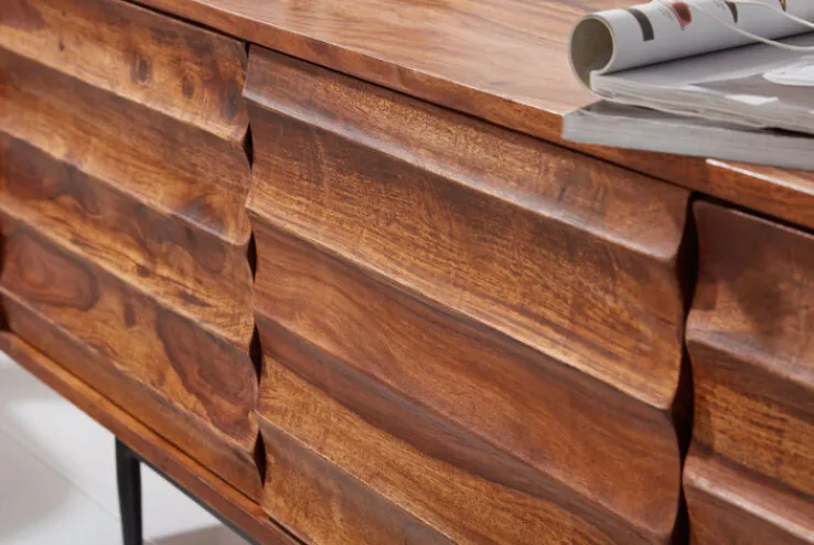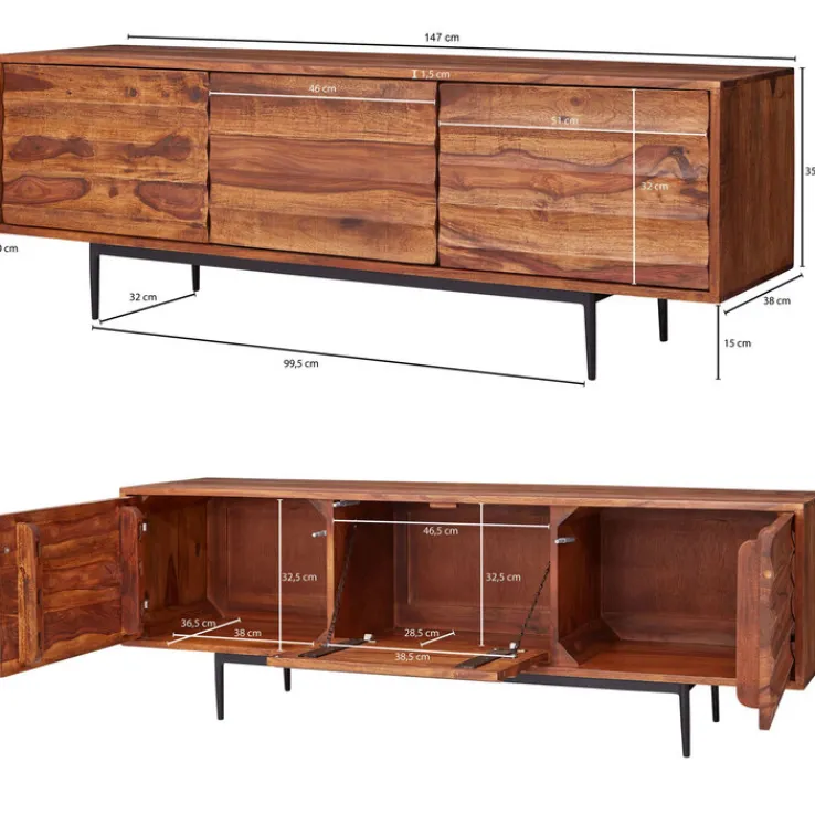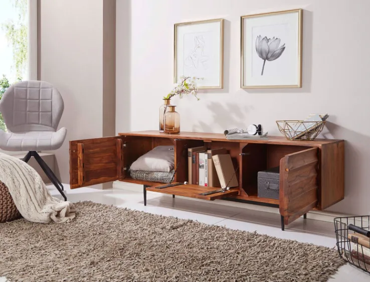 Dieses Möbel hat eine Tiefe von 38 cm und kommt inklusive zwei Drehtüren sowie einer Klappe. Somit dient es im Wohnzimmer als Stauraum, womit die Ordnung in selbigem unterstützt wird. Außerdem ist es so auch möglich die zu verstauenden Dinge getrennt voneinander aufzubewahren. Optisch besticht das Lowboard dank des Korpus aus massivem Holz einerseits und den Füßen, die aus schwarzem Metall bestehen andererseits, womit ein ansprechender Kontrast sichergestellt ist.