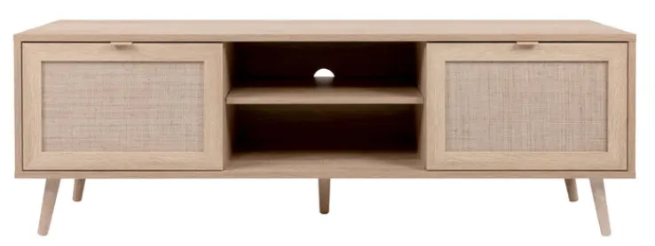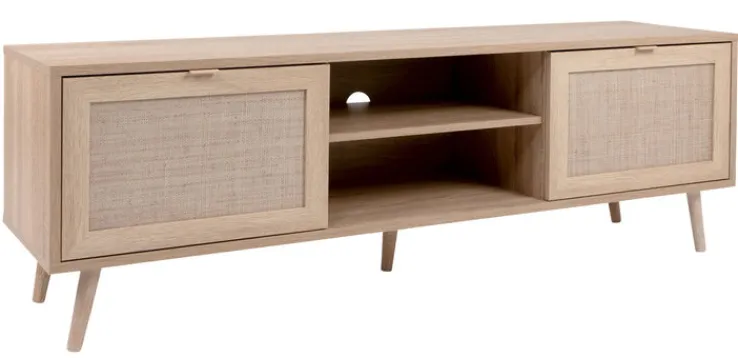 Das TV-Lowboard BALI kombiniert den Korpus in Eiche-Dekor mit eleganten Fronten in Geflecht-Optik und hohen Füßen aus massivem Eichenholz. Mit seinem stilvollen Look ist das TV-Lowboard ein schöner Blickfang für das Wohnzimmer, der ein natürliches Ambiente verleiht. Während die zwei offenen Gerätefächer Platz für Konsolen und Receiver bieten, lassen sich DVDs, Spiele und vieles mehr hinter den zwei Drehtüren unterbringen. Die Gerätefächer sind mit einem Kabeldurchlass ausgestattet und sichtbare Kabel liegen in der Vergangenheit.