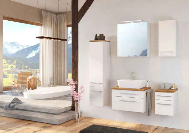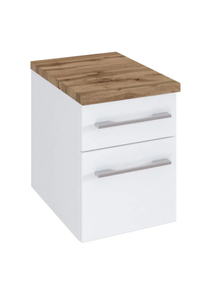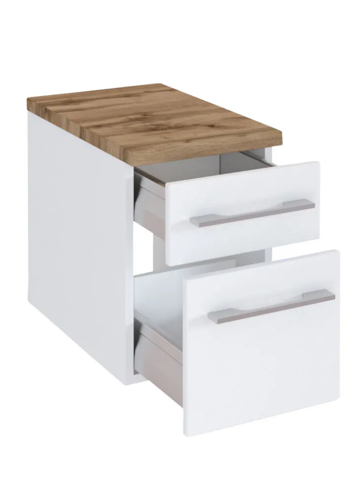Mit einem Unterschrank im Badezimmer kann ein besonderer Akzent gesetzt werden, wie mit dem 30 x 41 x 47 cm großen Möbel von DAVOS. Die weiß-matte Farbgebung von Front und Korpus korrespondiert hier mit einer aufgesetzten Deckplatte aus Wotan Eiche mit hochwertiger Echtholzstruktur. Die breiten alufarbenen Metallgriffe der Schublade mit Metallführung und der Auszug mit Softclose-Funktion bieten einen schönen Blickfang – hohe Funktionalität inbegriffen.
