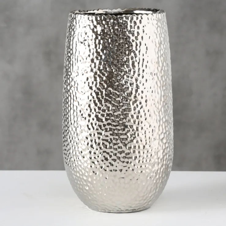 Womit die Vase sofort neugierige Blicke erntet, ist ihre ungewöhnlich strukturierte Oberfläche. Wird sie beleuchtet, entsteht eine besonders ansprechende Optik. Zugleich ist die Vase dank ihrer Silberfarbe optisch nicht zu dominant, sodass die Blumenpracht wunderbar zur Geltung kommen kann. Ob auf dem Esstisch, auf einer Kommode oder im Regal: Die Keramikvase fügt sich überall problemlos ein und verleiht dem Zuhause neuen Glanz. Wer eine einheitliche Optik mag, kann natürlich gerne mehrere der schönen Vasen kombinieren.