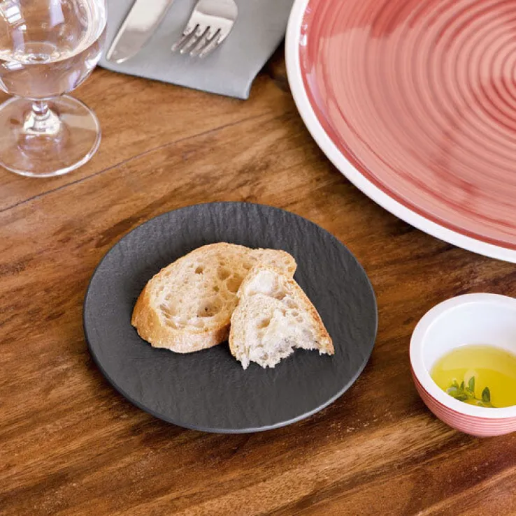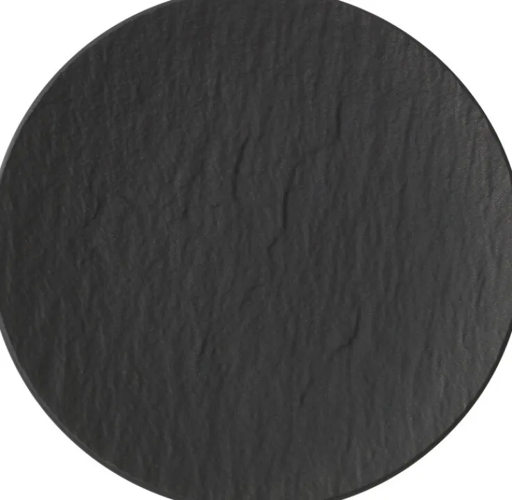 Dieser ausgefallene Teller MANUFACTURE ROCK in der Farbe Schwarzgrau/Schieferstruktur ist aus hochwertigem Premium Porzellan, etwa sechzehn Zentimeter groß und