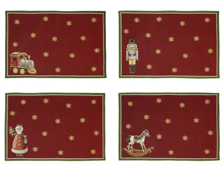 Dieses Set besteht aus vier rechteckigen Tisch- und Platzsets der Serie TOY’S DELIGHT von Villeroy & Boch. Jedes Set zeigt auf rotem Grund ein weihnachtliches Motiv, darunter eine Spielzeugeisenbahn, einen Nussknacker, einen Weihnachtsmann und ein Schaukelpferd. Die Motive sind jeweils in einer Ecke platziert, während goldfarbene Sterne gleichmäßig auf der Oberfläche verteilt sind. Die Umrandung ist grün abgesetzt, was die festliche Gestaltung unterstreicht. Die Maße betragen 48 cm in der Länge, 32 cm in der Breite und 0,2 cm in der Höhe. Das Gewicht eines Sets liegt bei 0,41 kg. Das Material besteht aus Baumwolle und weiteren Textilfasern. Die Sets eignen sich besonders für den Einsatz im Esszimmer und bieten eine stimmungsvolle Grundlage für den festlichen Tisch.