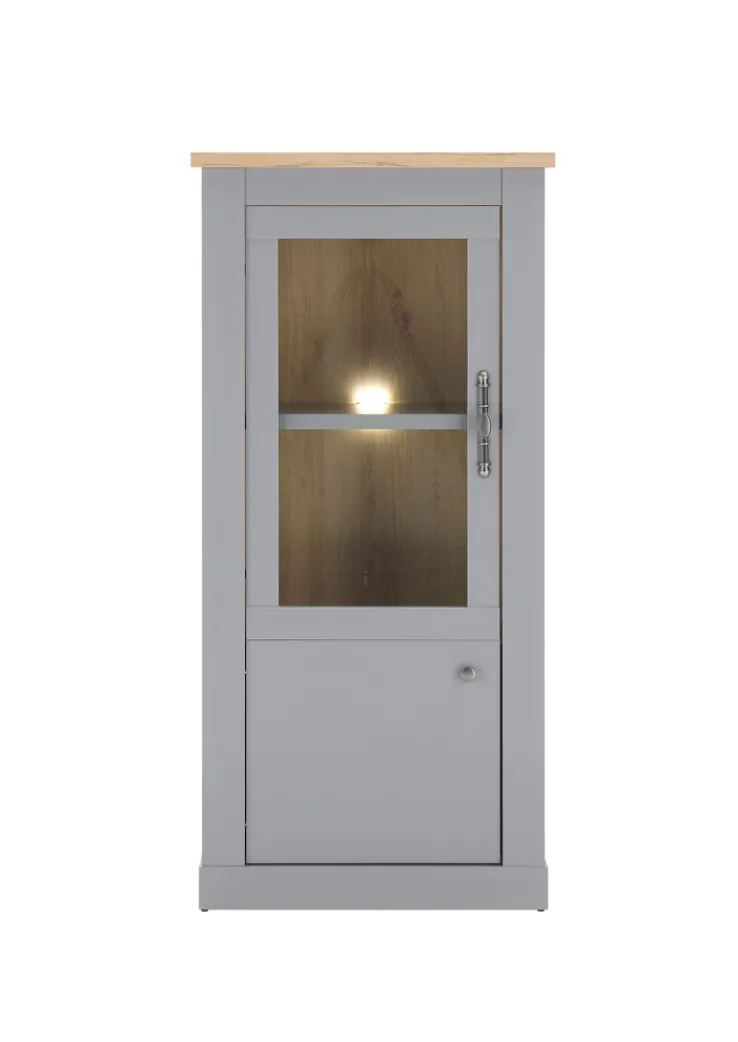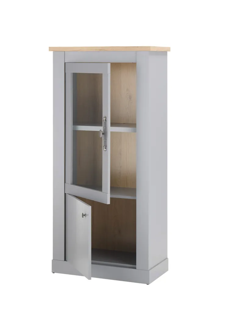 Hergestellt aus hochwertiger Holznachbildung bietet die 37 cm tiefe Vitrine CHAMBORD eine gute Stabilität. Das moderne Hellgrau kombiniert mit Applikationen in Artisan-Oak-Dekor verleiht dem Möbelstück einen modernen Look mit rustikalem Charme. Silberfarbige Metallgriffe runden das Design perfekt ab. Mit ihrem extravaganten Aussehen verleiht die Vitrine dem Wohnzimmer im Nu eine gemütliche Atmosphäre. Neben der Optik überzeugt sie mit viel Stauraum hinter zwei Drehtüren, einer davon mit Glaseinsatz.