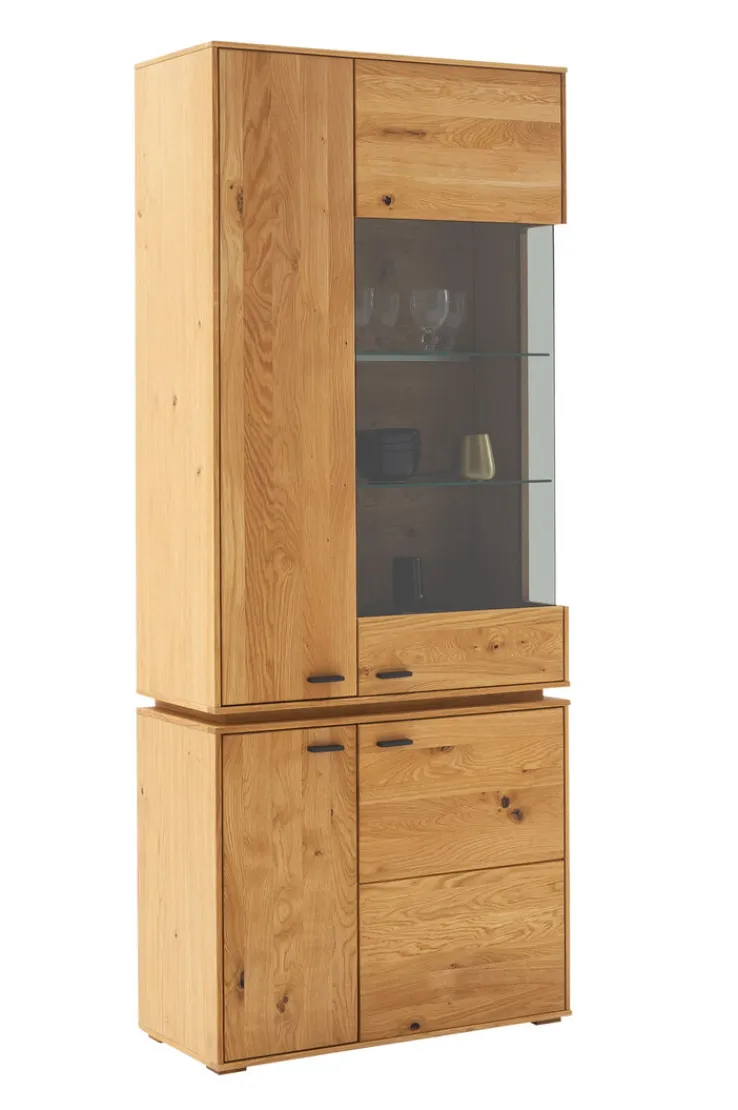 Diese Vitrine hat eine Breite von 83 cm, eine Höhe von 202 cm sowie eine Tiefe von 38 cm. Sie besteht aus furniertem, teilmassivem Holz, dessen Oberflächenbeschichtung geölt ist und kommt inklusive einer wechselbaren LED-Beleuchtung am Korpus, so dass sie abends ganz besonders gut in Szene gesetzt werden kann. Zudem verfügt diese Vitrine einerseits über viel Stauraum für Dinge, die man außerhalb der Sichtweite haben möchte. Andererseits ist sie aber auch ideal, um Deko-Artikel in ihr zur Schau zu stellen.