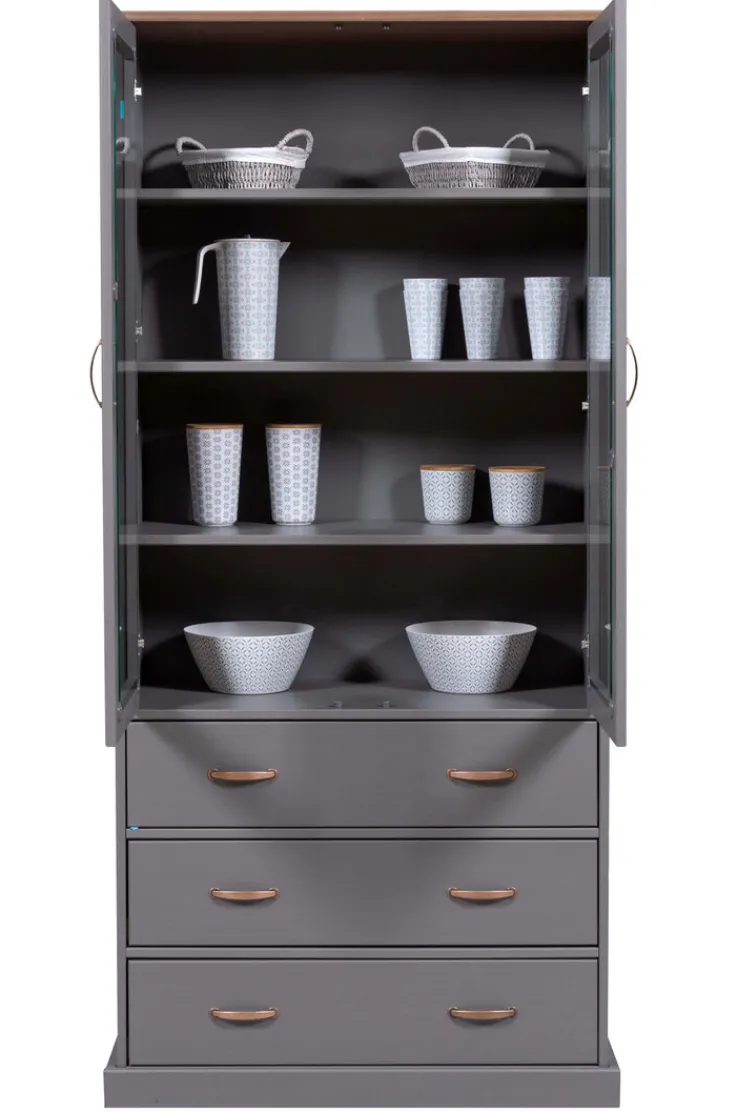 Die Vitrine NICLAS kombiniert das moderne Grau mit kupferfarbigen Griffen und einer in Kupferfarbe abgesetzten Deckplatte. Mit dieser attraktiven Farbkombination zieht das Möbelstück alle Blicke auf sich. Ein Highlight ist die Vitrine allerdings nicht nur optisch! Hinter ihren Glastüren bietet sie auf vier Ebenen ausreichend Platz für das schönste Porzellan und elegante Gläser. In den drei breiten Schubkästen bietet der Vitrinenschrank weiteren Stauraum für Servietten, Besteck und vieles mehr.