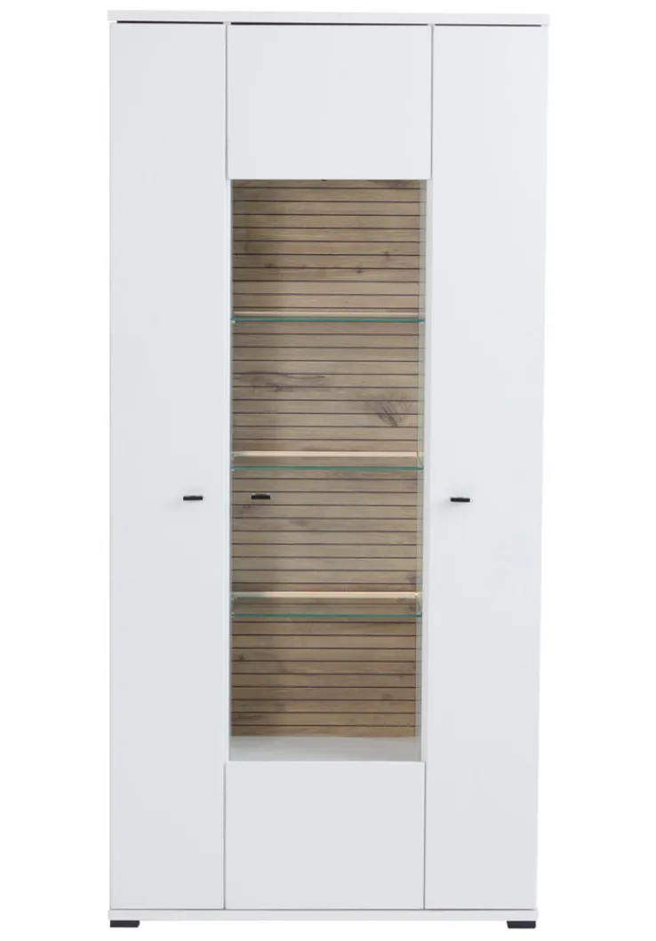 Die Vitrine aus der OLIVIO-Serie besticht durch ihr modernes Design und die Kombination aus Weiß und Nox Oak Stripes. Mit einer Breite von 95 cm, einer Höhe von 197 cm und einer Tiefe von 37 cm bietet sie ausreichend Platz für Ihre Lieblingsstücke. Die Vitrine verfügt über drei Drehtüren und insgesamt elf Einlegeböden, die eine flexible Gestaltung des Innenraums ermöglichen.
