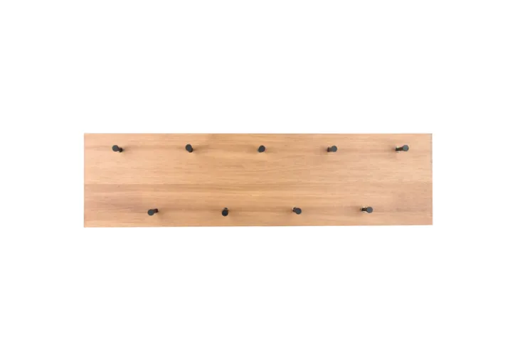 Die aus massivem Eichenholz hergestellte Wandgarderobe SAMANTHA passt in der Farbe Braun ideal in jede Diele. Das Modell mit den neun Haken aus schwarzem Metall hat die Maße 75 Zentimeter Breite, 20 Zentimeter Höhe und 9,2 Zentimeter Tiefe.