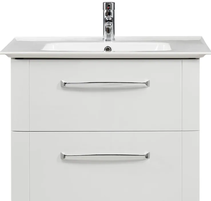 Der Waschbeckenunterschrank präsentiert sich in einem modernen Design und ist in einem eleganten Weiß gehalten, das sich nahtlos in verschiedene Badezimmerstile einfügt. Mit einer Breite von 72 cm, einer Höhe von 55 cm und einer Tiefe von 43 cm bietet er ausreichend Stauraum, um Badezimmerutensilien ordentlich zu verstauen. Die zwei integrierten Schubkästen sind mit einer Soft-Close-Funktion ausgestattet, die ein sanftes und geräuschloses Schließen ermöglicht.