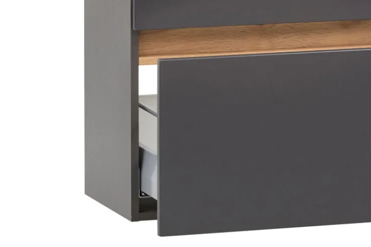 Der Waschbeckenunterschrank BRÜGGE benötigt eine Stellfläche von 61 x 55 x 40 cm und besteht aus solider Holznachbildung. Seinen Korpus in Graphitgrau kombiniert er mit mattgrauen Fronten. Die Baumkantenplatte und die Blende in Holzfarbe verleihen dem Unterschrank einen rustikalen Twist und machen ihn zum Eyecatcher. Doch nicht nur optisch überzeugt das Möbelstück. In einem geräumigen Schubkasten mit Soft-Close bietet er ausreichend Platz. Die Oberplatte ist mit einem Siphonausschnitt versehen, der die Installation des Waschbeckens erleichtert.