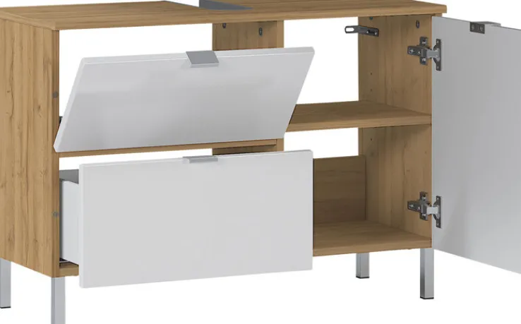 Der exklusive Waschbeckenunterschrank FEY in der Gestaltung Eiche Nachbildung mit Hochglanz weißen Fronten ist ein perfekter Begleiter für jedes Bad. Das tolle Kleinmöbel passt mit einem Maß von 80 cm x 56 cm x 36 cm hervorragend unter das Waschbecken und bietet Stauraum für Hygieneartikel, Handtücher oder Putzmittel.