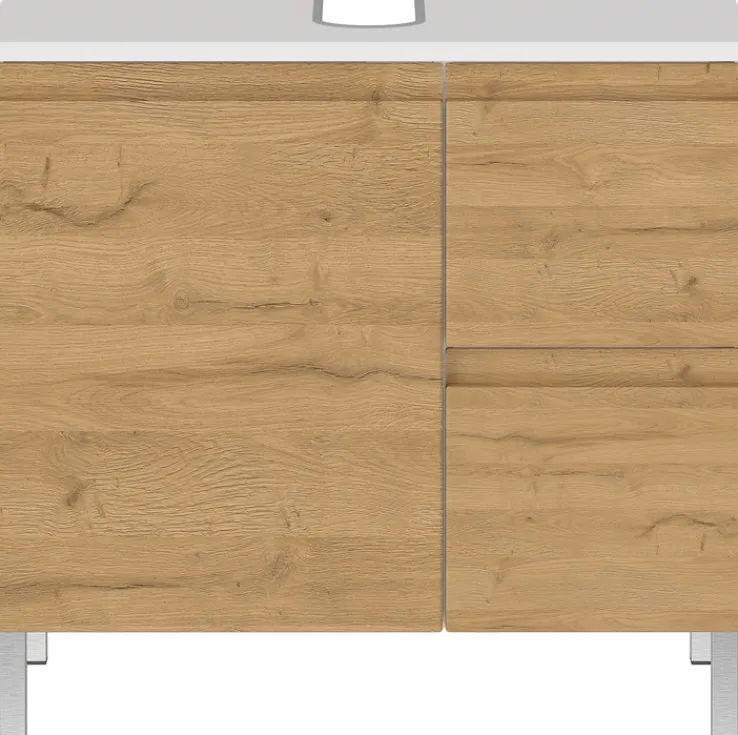 Der Waschbeckenunterschrank aus solider Holznachbildung kombiniert einen weißen Korpus mit Fronten samt Griffleisten in Grandson-Eiche Nachbildung. Dank einer Kombination aus tiefgezogener Front, ABS-Kanten und Melamin beschichteten Oberflächen ist der Unterschrank robust und ideal für die tägliche Benutzung. Für jede Menge Stauraum sorgen zwei Schubkästen mit Selbsteinzug sowie zwei geschlossene Fächer. Die Drehtüren sind mit Soft-Close ausgestattet, wodurch unangenehmes Zuschlagen der Türen verhindert wird. Ein weiterer Pluspunkt des Waschbeckenunterschranks ist der Siphonausschnitt, der die Installation des Waschbeckens erleichtert.