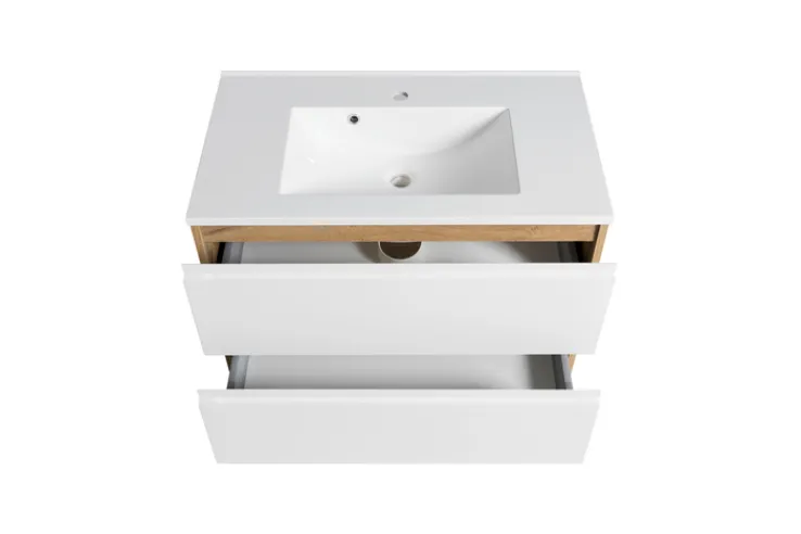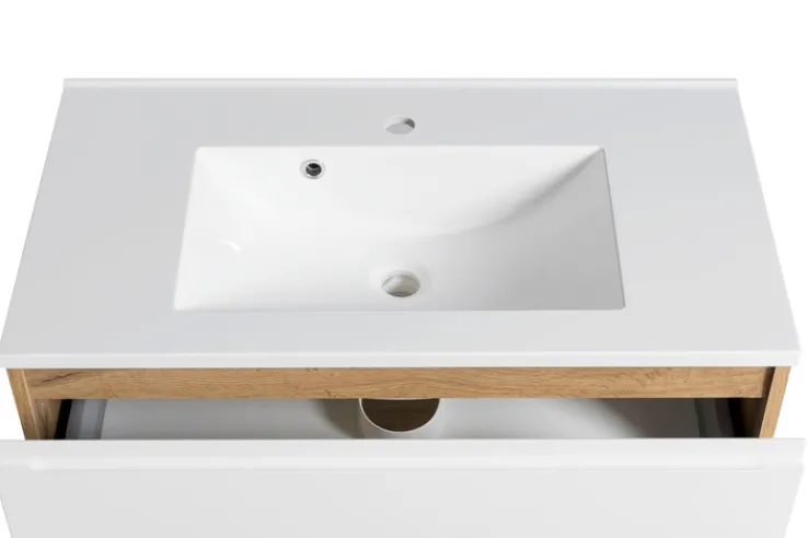 Der trendstarke, weiß-braune Waschtisch GENT ist 80 cm breit und wird mit dem passenden Mineralgussbecken geliefert. Seine Höhe beträgt 56 cm, die Tiefe 47 cm.