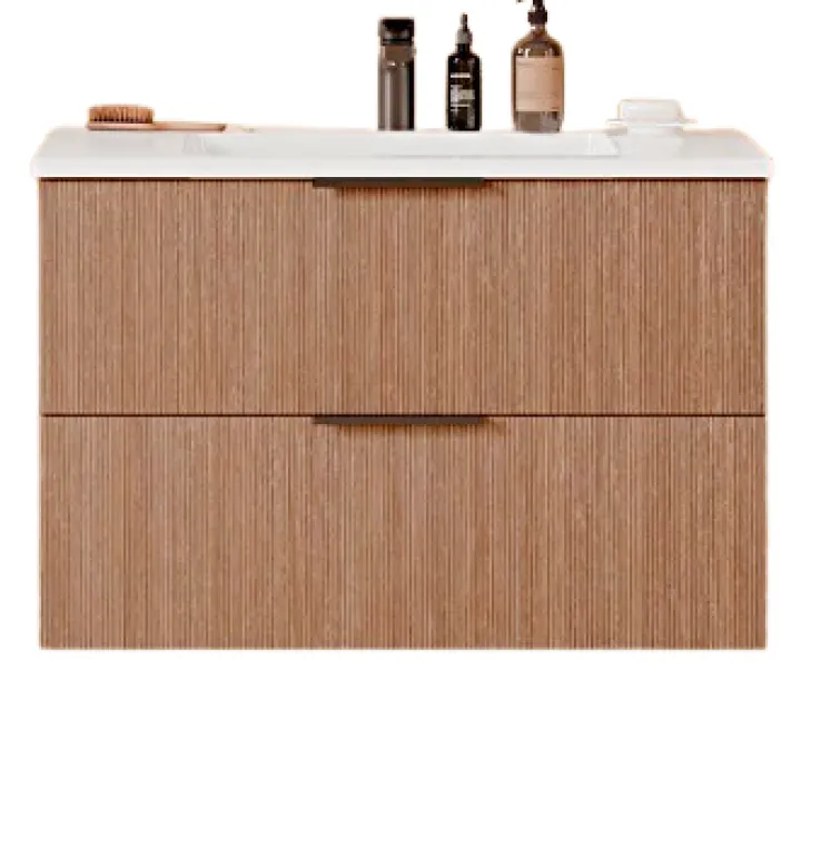 Der Waschtisch aus der Serie MENZO überzeugt durch seine klare Linienführung und eine moderne, geradlinige Optik. Die Front und der Korpus präsentieren sich in einer warmen Holzoptik mit feiner vertikaler Struktur, was dem Möbelstück eine natürliche Ausstrahlung verleiht. Die Oberfläche ist glatt und wirkt durch die Maserung besonders wohnlich. Das Design ist griffminimalistisch gehalten, mit einem dezenten, mittig platzierten Griff an jeder Schublade.