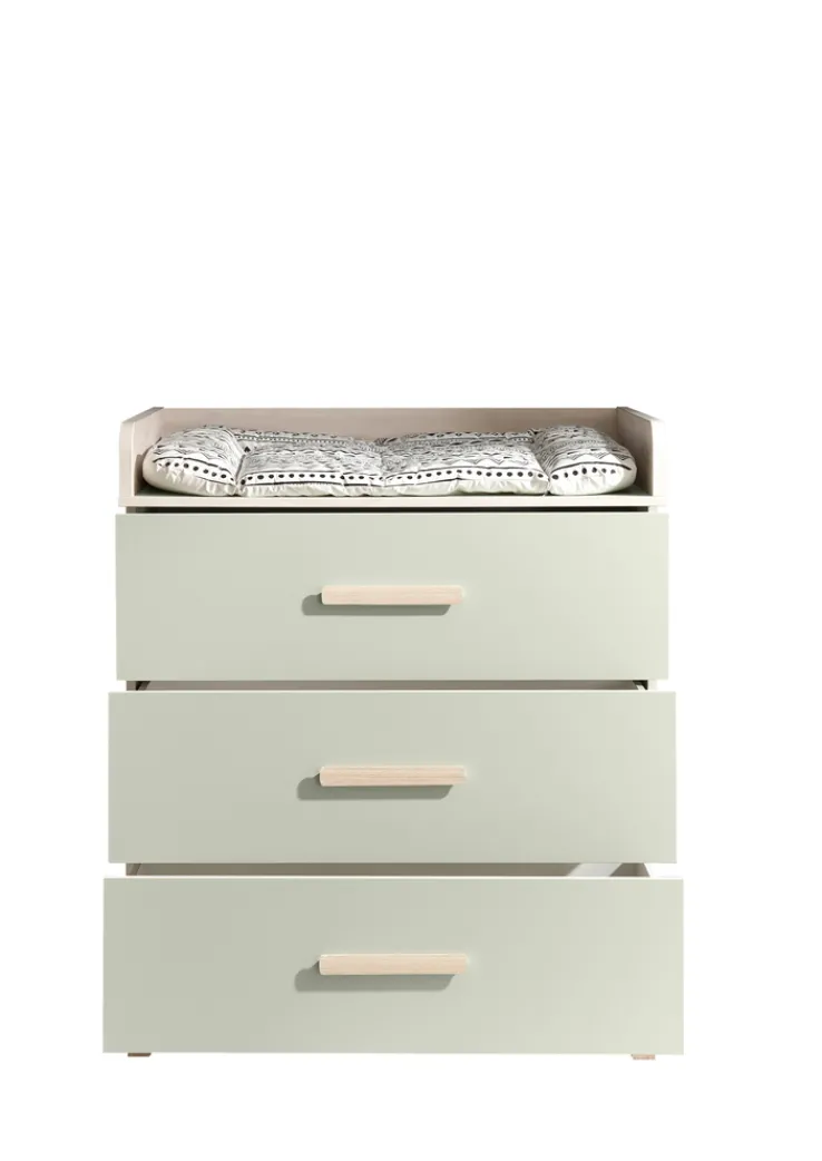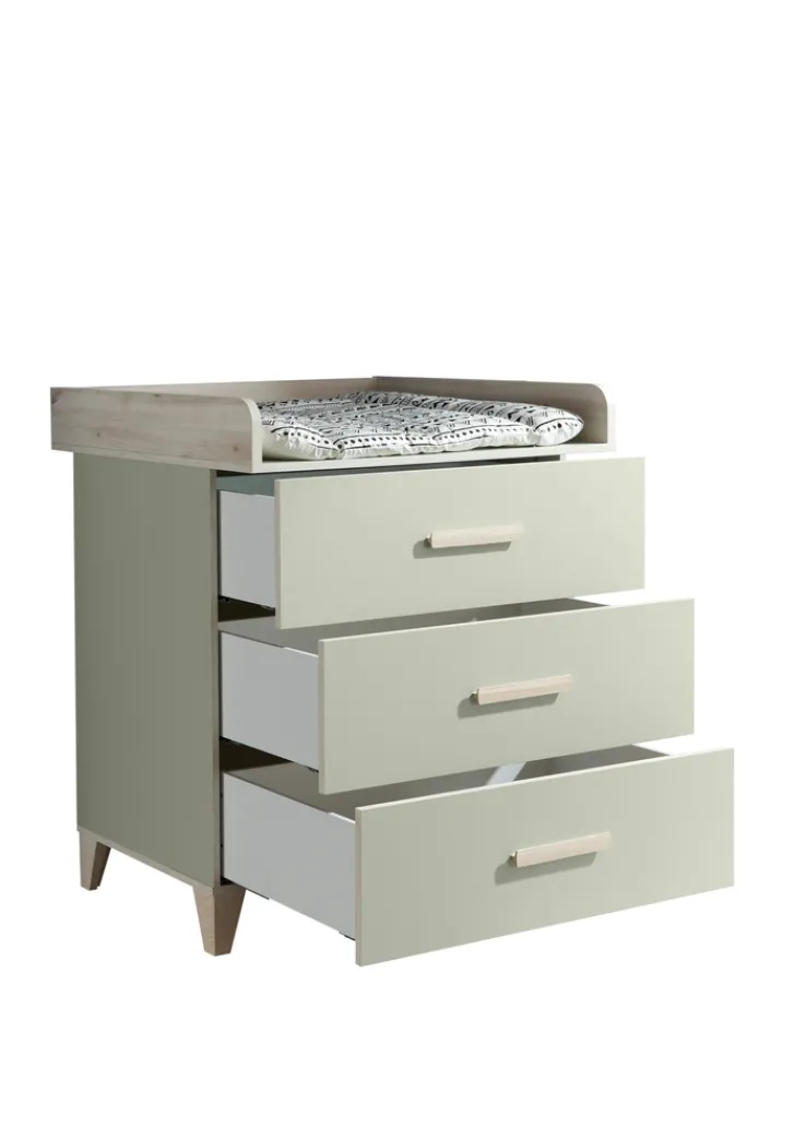 Ob im Kinderzimmer, im Schlafzimmer der Eltern oder in einer anderen gemütlichen Räumlichkeit – diese qualitativ hochwertige Wickelkommode PRIZZI in schönem Pastellgrün bzw. braun zieht die Blicke aufgrund ihrer attraktiven Konzeptionierung rasch auf sich. Mit ihren drei Schubladen, die sich leicht öffnen und schließen lassen, bietet sie jede Menge Stauraum für Windeln, Tücher, Babypflegeprodukte und vieles mehr. Dank der Tiefe bzw. Ausladung von 78 cm liegt das Baby sicher und komfortabel auf der extra soliden Oberfläche.
