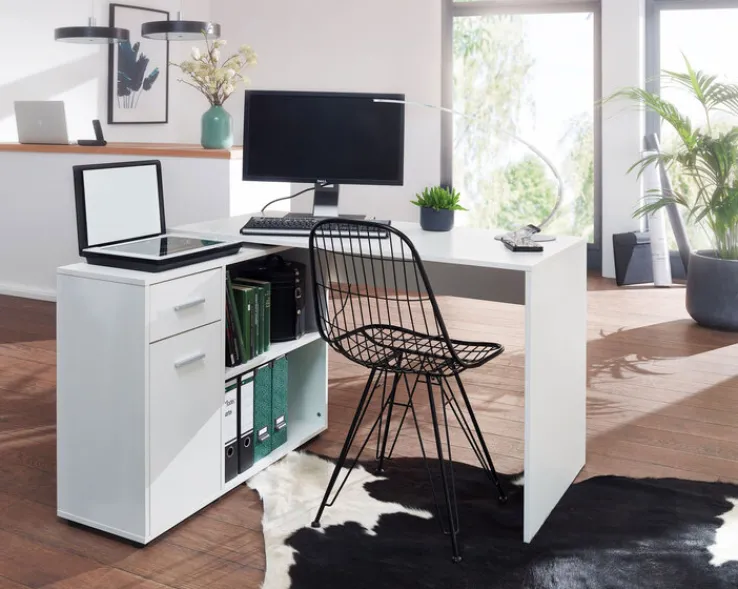 Mit Abmessungen von 120 x 107 cm zeigt das Modell in Weiß, wie geräumig und doch kompakt ein Winkelschreibtisch sein kann. Als Materialien kommen Holznachbildung und Kunststoff zum Einsatz. Alternativ können die beiden Schreibtisch-Teile in einer Geraden mit einer Länge von knapp 180 cm angeordnet werden.