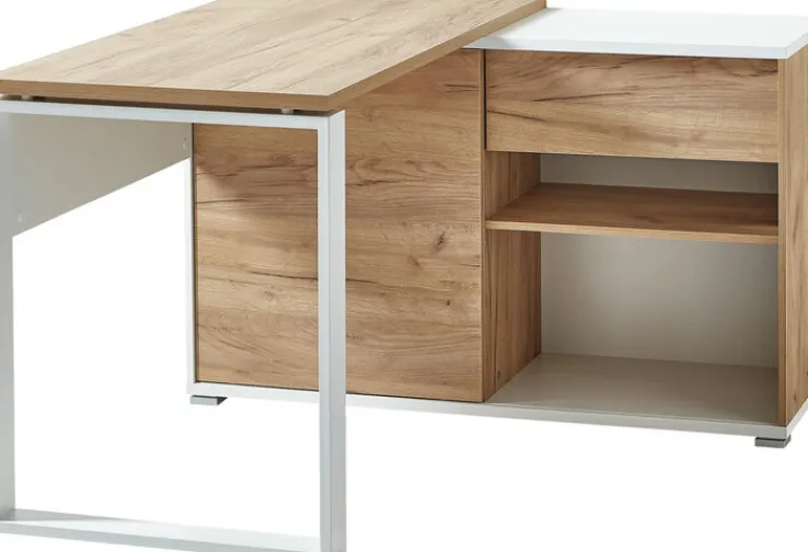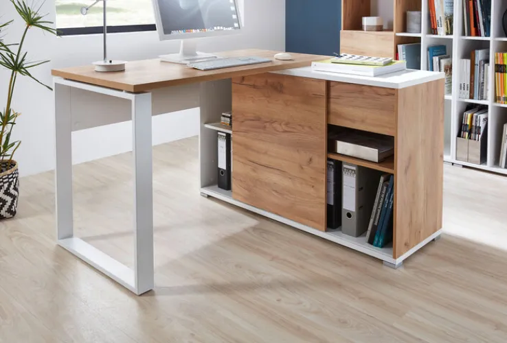 Der funktionelle Winkelschreibtisch LION mit den Maßen 117 x 120 cm ist die praktische Ecklösung für kleinere Jugend- oder Arbeitszimmer. Durch seine Oberflächen in der Farbe weiß und Navarra-Eiche ist der funktionell gestaltete Arbeitsplatz sehr gut in bereits bestehende Einrichtungen integrierbar. Die große Schreibtischplatte und die Oberplatte des Sideboards bieten viel Platz für verschiedene Arbeitsmaterialien. Zusätzlicher Stauraum steht in einem offenen Fach mit Einlegeboden, einem Schubkasten und einem Schrank mit Schiebetür zur Verfügung.