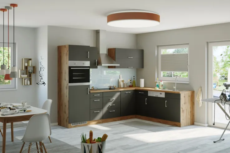 So viel Küche auf kleinem Raum! Die Winkelzeile ODENSE ist perfekt für alle, die sie auch an einer Wand mit Fenster stellen wollen. Bei Bedarf können Geräte und Schränke auch seitengespiegelt montiert werden. Zum Design mit der trendigen Farbe kommt noch jede Menge Komfort, etwa durch die höhenverstellbaren Füße und die funktionellen Schubladen. Küchengeräte wie Geschirrspüler, Kochfeld und Dunstesse, Backofen und Gefrier-Kühl-Kombination sind bereits in die Winkelzeile integriert. Sie wird zerlegt geliefert, bitte Hinweise am Produkt beachten.
