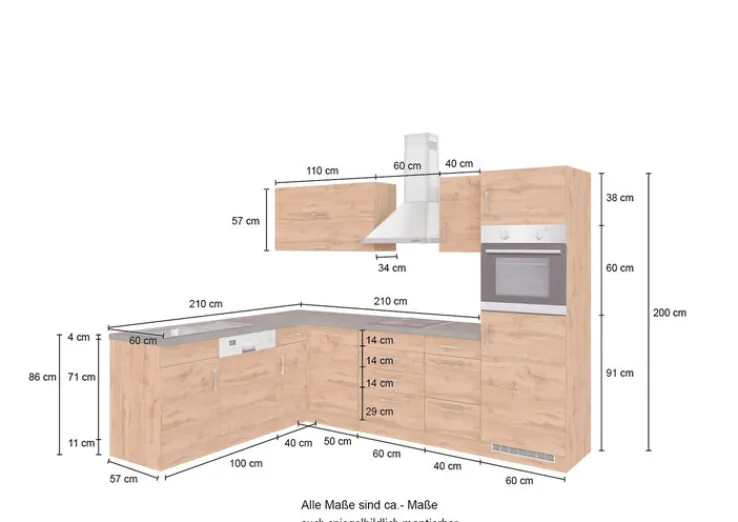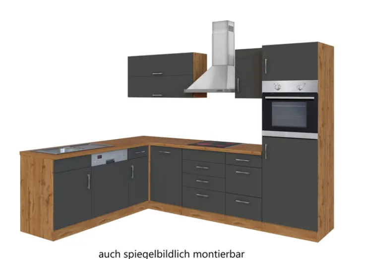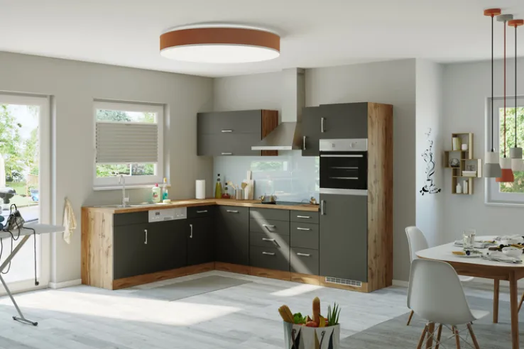 Die Winkelzeile ODENSE misst 210 x 270 cm. Sie ist 60 cm tief und 200 cm hoch. Ihre Fronten mit den Metallgriffen sind in anthrazitfarbener Holznachbildung, Korpus, Sockel und Arbeitsplatte zeigen ein naturfarbenes Wotan Eiche Dekor.