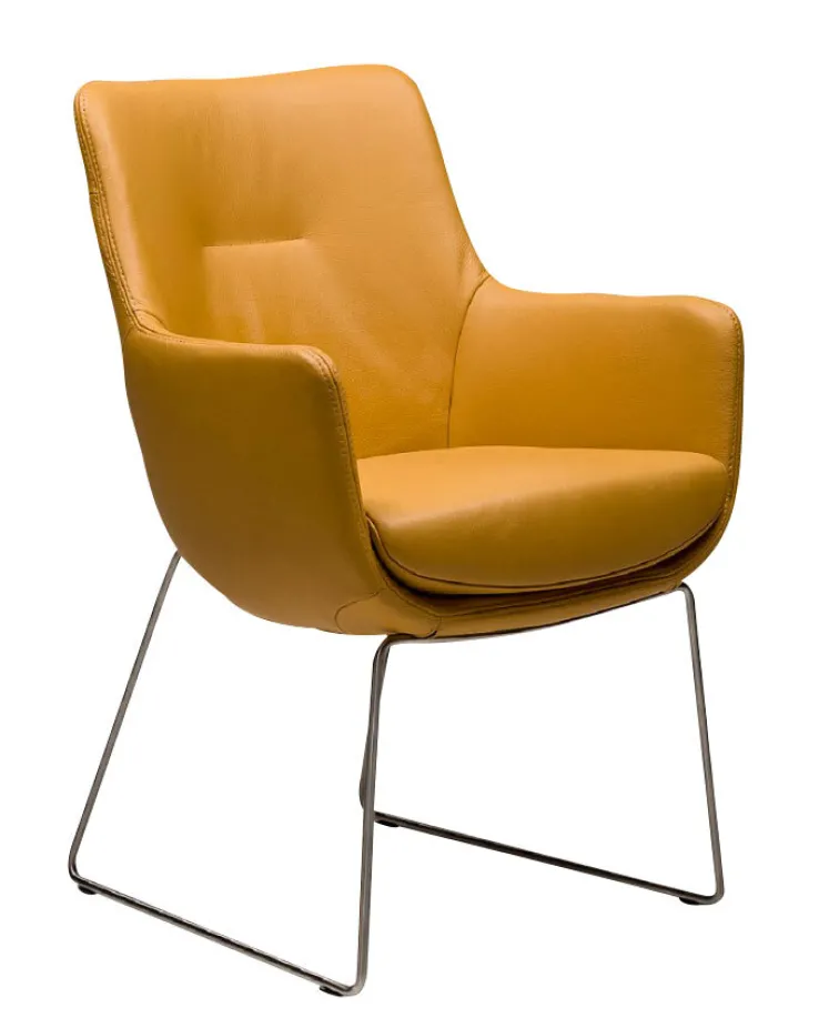 Der WK-WOHNEN Armlehnstuhl hat eine Größe von 60 x 89 x 61 cm und kombiniert ein braunes Kufengestell aus Edelstahl mit einer komfortablen Sitzschale mit gelbem Lederbezug. Für einen hohen Sitzkomfort ist die Sitzschale mit Polyetherschaum gepolstert. Feste Armteile und eine komfortable Sitzhöhe von 51 cm perfektionieren den komfortablen Sitz. Damit Holzböden nicht zerkratzt werden, ist das Kufengestell mit Filzgleiter versehen. Neben dem erstklassigen Komfort überzeugt de Armlehnstuhl mit einem angesagten Look, der sich mit klassischen und modernen Möbeln kombinieren lässt.