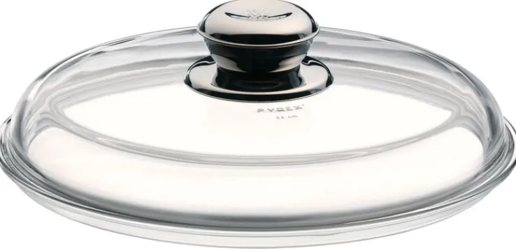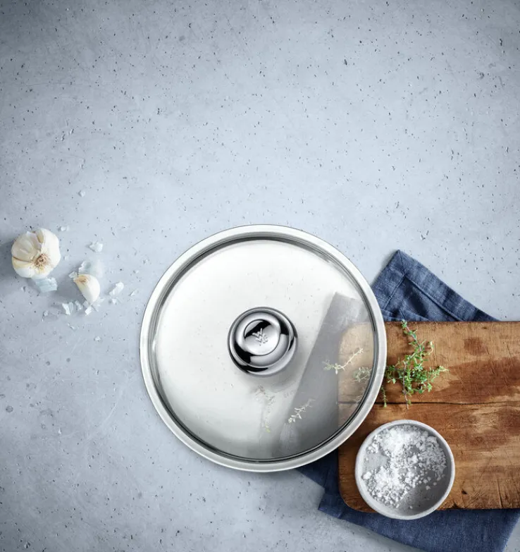 Der Rand und der stabile Knopf des Deckels sind aus rostfreiem Edelstahl 18/10 gefertigt. Die Oberflächen des Metalls sind poliert. Der Deckel besteht aus gebogenem Sicherheitsglas und ist transparent. Der hochwertig verarbeitete Deckel ist hitzebeständig bis 180 °C und dadurch auch problemlos im Backofen verwendbar. Der Deckel ist spülmaschinengeeignet.