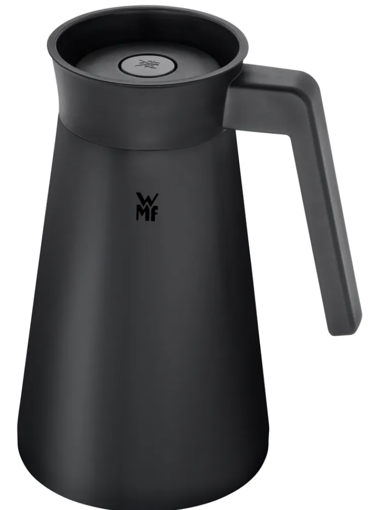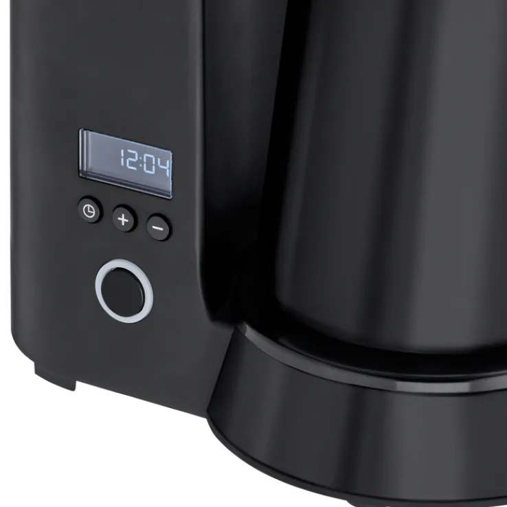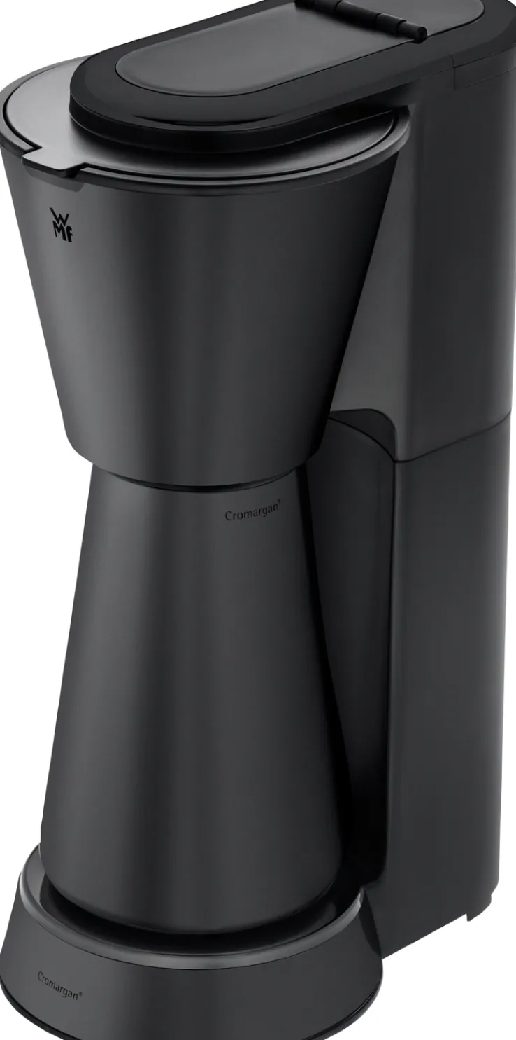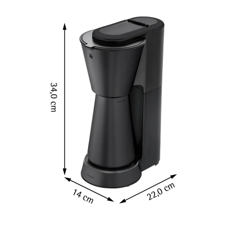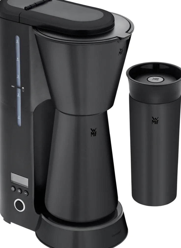 Mit einem Fassungsvermögen von 625 ml eignet sich das Gerät für kleinere Haushalte oder Einzelpersonen. Die Kaffeemaschine bietet eine gut ablesbare Wasserstandsanzeige an der Seite sowie eine übersichtliche Bedienoberfläche mit Tasten und Display im unteren Bereich. Die mitgelieferte Thermokanne und ein passender Becher sind im gleichen tiefschwarzen Farbton gehalten und fügen sich optisch harmonisch in das Gesamtbild ein. Das Produkt ist speziell für den Einsatz in der Küche konzipiert und gehört zur Marke WMF.