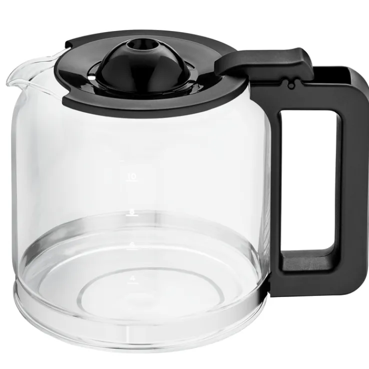 Diese Kaffeemaschine der Serie STELIO BLACK von WMF präsentiert sich in einem klaren, funktionalen Design mit tiefschwarzem Gehäuse. Die Maschine besteht aus einer Kombination von Glas und Metall. Die Hauptfarbe ist Schwarz, ergänzt durch transparente Elemente an der Glaskanne und eine gut ablesbare Wasserstandsanzeige an der Gerätefront. Das kompakte Format mit einer Länge von 18,5 cm, einer Breite von 31,5 cm und einer Höhe von 36 cm eignet sich gut für den Einsatz in der Küche. Das Fassungsvermögen der Kanne beträgt 1.250 ml und das Gewicht der Maschine liegt bei 2,88 kg. Der Griff der Glaskanne ist ergonomisch geformt, und die Maschine verfügt über eine klassische Tastenbedienung. Alle sichtbaren Oberflächen zeigen eine matte bis leicht glänzende Struktur ohne Muster oder Dekor. Die Linienführung ist geradlinig und die Formgebung sachlich. Die Kaffeemaschine ist für den täglichen Gebrauch im Küchenbereich konzipiert.