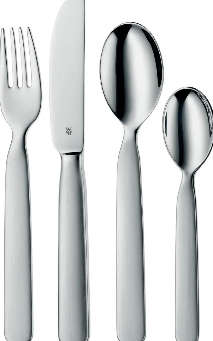 Das WMF Kinderbesteck-Set FIRST LYRIC ist 4-teilig und besteht aus langlebigem Edelstahl. Das Set aus Gabel, Messer und zwei unterschiedlich großen Löffeln ist für Kinder ab drei Jahren geeignet. Ein großer Vorteil ist die Eignung für die Spülmaschine.