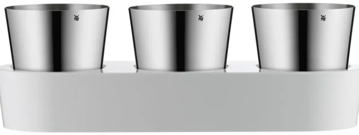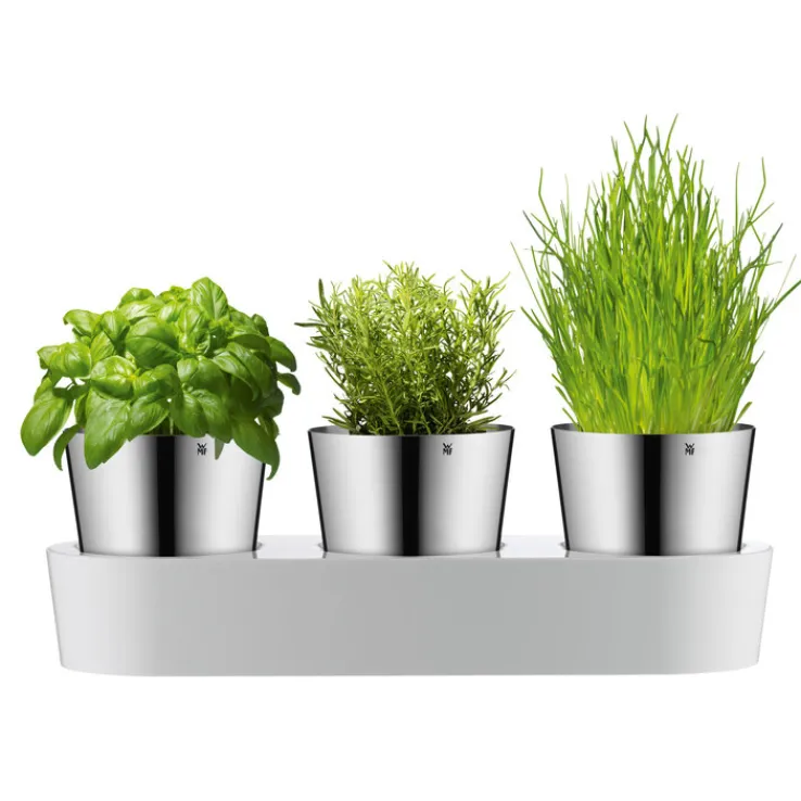 Die drei Töpfe aus rostfreiem Edelstahl mit polierter Oberfläche bieten Platz für Ihre Lieblingsküchenkräuter. Außerdem ist jeweils ein Glasfaserdocht enthalten, der für die Wasserversorgung zuständig ist. Nach dem Bepflanzen kommen diese in die Basisschale aus weißem Kunststoff. Sie fungiert zugleich als praktischer Tank und stabile Halterung. Zum Nachfüllen des Behälters nach einigen Tagen öffnen Sie einfach den dazugehörigen Deckel. Passend zum WMF Kräutergarten finden Sie in Ihrem porta! Online Shop weitere Kräutertöpfe, Mörser zum Zermahlen und spezielle Messer, die für die Zubereitung der Kräuter wichtig sind.