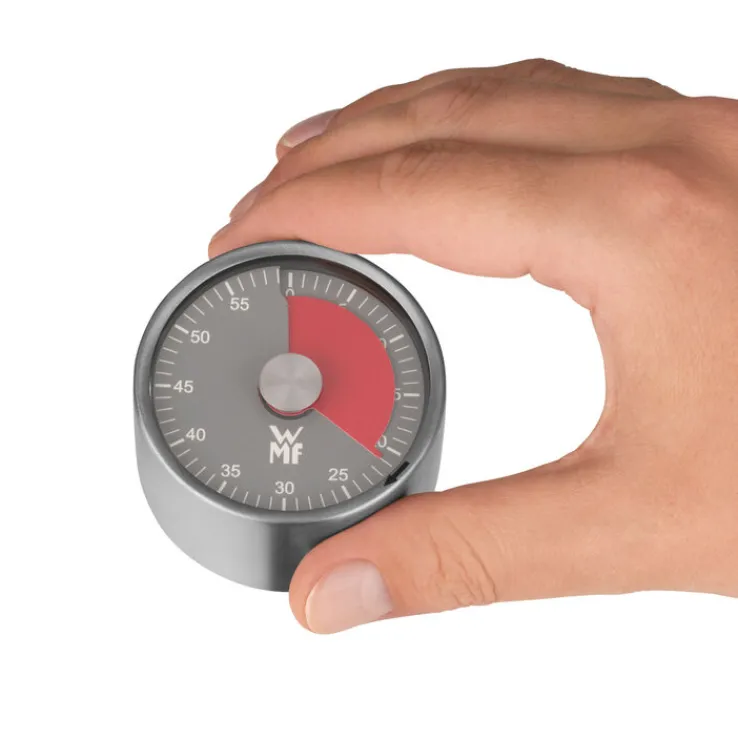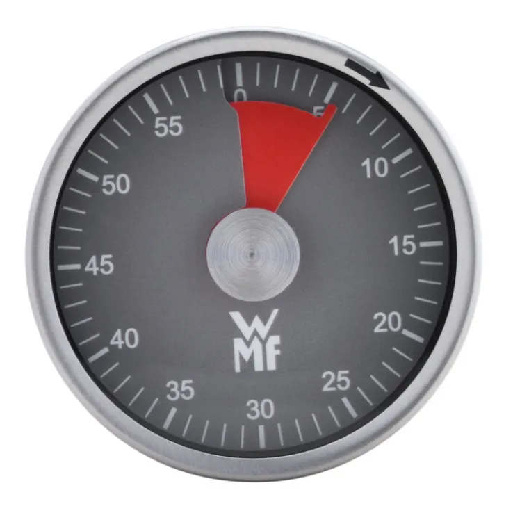 Der mechanische Küchentimer haftet beispielsweise am Kühlschrank oder an der Dunstabzugshaube und besitzt eine Laufzeit von 1-60 Minuten, danach ertönt ein akustischer Alarm. Die verbleibende Restzeit wird in einer roten Fläche angezeigt, die mit Ablaufen der Zeit abnimmt. Die zweifarbige Anzeige garantiert eine einfache Überwachung. Der WMF Magnetischer Kurzzeitmesser aus der Serie Kitchen classics ist ein unverzichtbares Küchenaccessoire, um genaue Koch-, Brat- und Backzeiten einzuhalten. Er vereint clevere Funktion mit robuster und langlebiger Materialqualität.