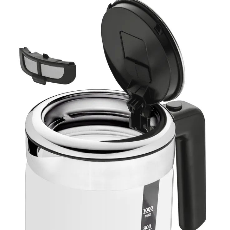 Der Behälter aus bruchfestem Glas ist hat eine Komfort-Einhanddeckelöffnung auf Knopfdruck und ist geschmacksneutral. Der Behälter, das Teesieb und der Kalkfilter sind einfach von Hand zu reinigen.