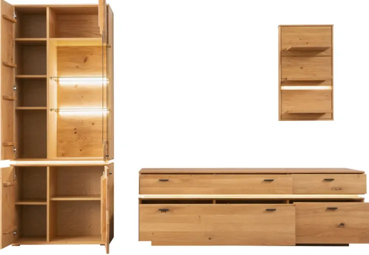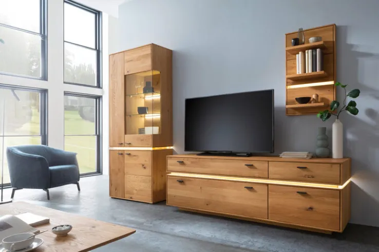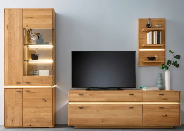 Diese Schrankwand besteht aus einem TV-Lowboard, einer Vitrine sowie einem Wandregal. Sie hat eine Tiefe von 51 cm, eine Breite von 286 cm und eine Höhe von 181 cm. Sie bietet viel Stauraum, so dass sie die Ordnung im Wohnzimmer unterstützt. Des Weiteren punktet sie damit, dass sie über eine wechselbare Beleuchtung am Korpus verfügt, wodurch sie abends ganz besonders gut in Szene gesetzt werden kann. Beim Holz handelt es sich um furnierte teilmassive Eiche, deren Oberflächenbeschichtung geölt ist.