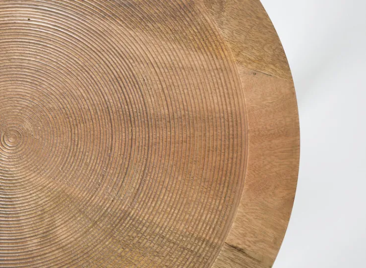 Der runde zuiver Beistelltisch DRENDRON S kombiniert ein Vierfußgestell mit leicht schräg gestellten Beinen mit einer Tischplatte mit Rillenmuster. Er ist zur Gänze aus massivem Mangoholz gefertigt und für eine noch bessere Strapazierfähigkeit farblos lackiert. Dank der Verwendung von Massivholz ist das Tischchen sehr robust und hält einem Gewicht von maximal 25 kg stand. Der Beistelltisch lässt sich mit seinem natürlichen Design vielseitig kombinieren.