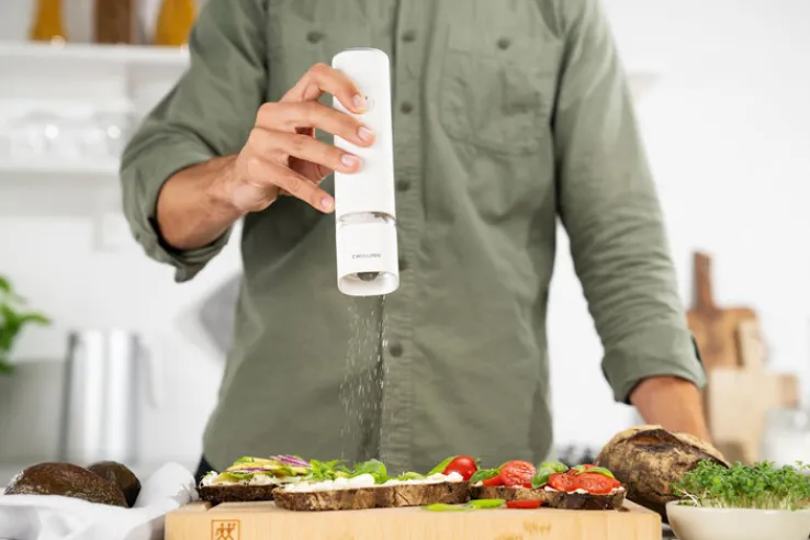 Die elektrische Salz- & Pfeffermühle ENFINIGY von ZWILLING in der Farbe Weiß ist ideal bei Tisch oder in der modernen Küche. Entworfen von den Mailänder Designern Matteo Thun und Antonio Rodriguez, macht die akkubetriebene Mühle eine gute Figur. Die zylindrische Gewürzmühle mahlt Salz, Pfeffer oder Gewürze auf Knopfdruck. Das hochwertige Keramikmahlwerk ist nahezu verschleißfrei. Der leistungsstarke Motor der Salz- & Pfeffermühle mahlt ganz nach individueller Einstellung grob oder fein.